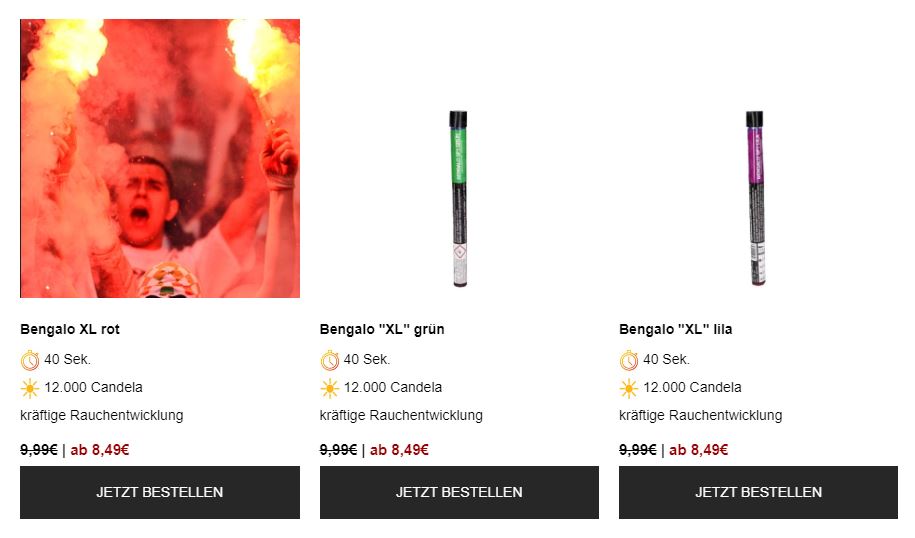 Platz 3: Bengalo "XL" in Rot vom 01.12.2020, 16:57 Uhr 2.421 Die besten Artikel für Silvester die man noch bestellen kann - Bengalo "XL" Platz 3: Bengalo "XL" in versch. Farben 40 Sekunden Rauch mit ca. 12.000 Candela Helligkeit« Platz 4 Platz 2»Bengalos können noch bestellt werden! | BildquelleWeiter zu Platz 2