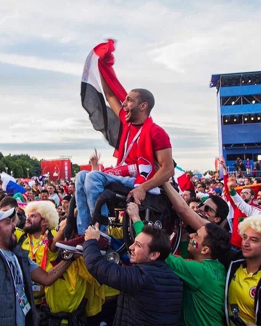 Tolle Aktion in Russland! Auf der Fanmeile ereignete sich Freitag eine tolle Geschichte: ein im Rollstuhl sitzender Ägypter besuchte das PublicViewing zum Auftaktspiel seiner ägyptischen Mannschaft. Da dem jungen Mann die Sicht auf die Leinwand im Rollstuhl aufgrund seines Handicaps verwehrt blieb, schnappten sich Fans aus Mexiko und Kolumbien kurzerhand den Ägypter und hielten ihn während der gesamten Live-Übertragung gegen Uruguay, inmitten der Menschenmenge hoch.