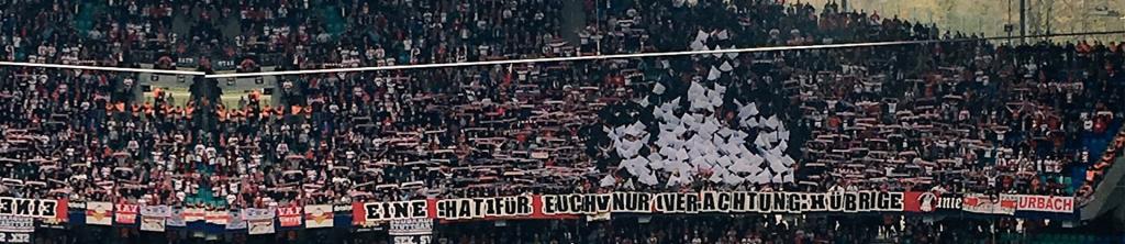 Zum heutigen Samstagspiel traf der VfB Stuttgart das erste Mal in der Vereinsgeschichte auf den umstrittenen Brauseclub RB Leipzig. Da im Zentralstadion bekanntermaßen RB-kritische Banner und Choreographien untersagt sind, ließen die Cannstatter Ihrer Kreativität freien Lauf und funktionierten zum Anpfiff ihre Fahne mit der Aufschrift "Eine stolze Kurve voller Geschichte" kurzerhand durch das ersetzen bzw. überhängen einzelner Buchstaben um. Während auf dem Banner nun "Eine Kurve voller Stolz hat für euch nur Verachtung übrig!" zu lesen war und Richtung Leipziger Fans zeigte, bildete sich im Oberrang ein Mittelfinger aus schwarzen und weißen Pappen.