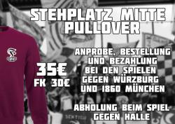 Die Fortuna Eagles verkaufen einen "Stehplatz Mitte" Pullover. Bei den Spielen gegen Würzburg und München kann dieser anprobiert, bestellt und bezahlt werden. Beim Spiel gegen Halle kann dieser dann abgeholt werden.