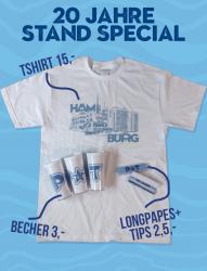 Ein T-Shirt für 15€, einen Becher für 3€ und Longpapes + Tips für 2,5€ gibt es zu kaufen.