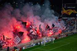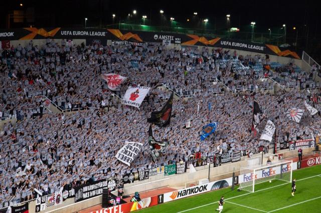 Über 5.000 Frankfurter sorgen in Zypern mit einer Choreo- & Pyroshow für eine Heimspielatmosphäre.