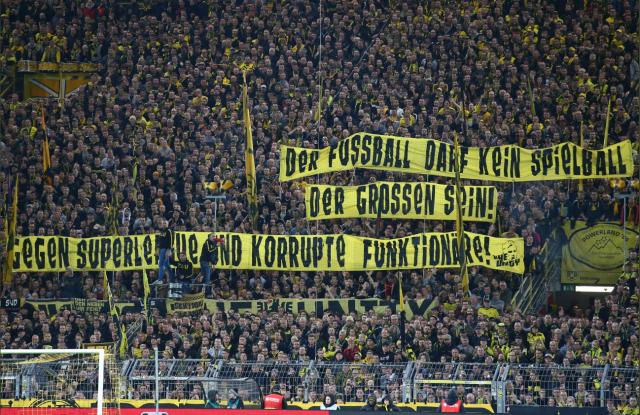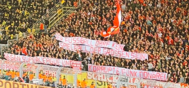Beim Spiel Borussia Dortmund gegen den FC Bayern haben beide Fanlager geschlossen gegen die Super League protestiert.