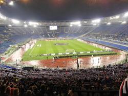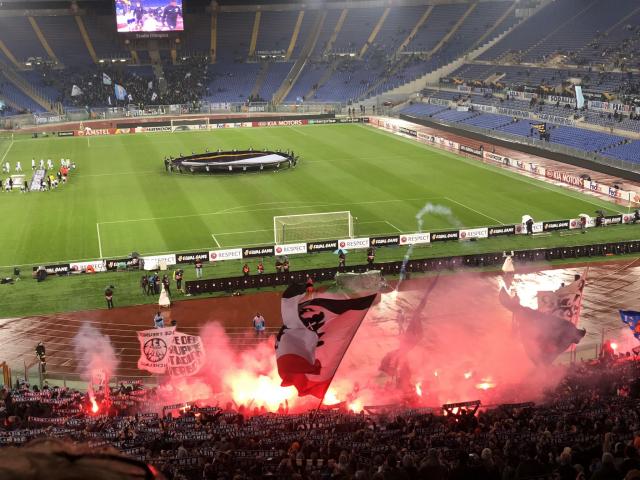Die Eintracht Fanszene hat beim Auswärtsspiel in Rom eine Pyroshow und eine Schalparade mit Fanschals mit der Aufschrift „Lazio Merda“ („Scheiß Lazio“) gezeigt.