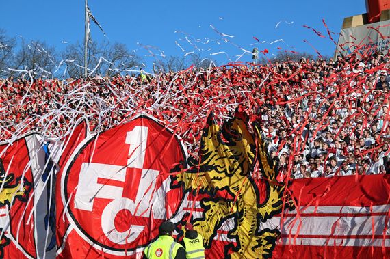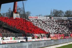 Die Fans des 1. FC Kaiserslautern zeigten beim Derby in Karlsruhe eine mehrteilige Choreo im Gästeblock. Bilder: Der Betze brennt