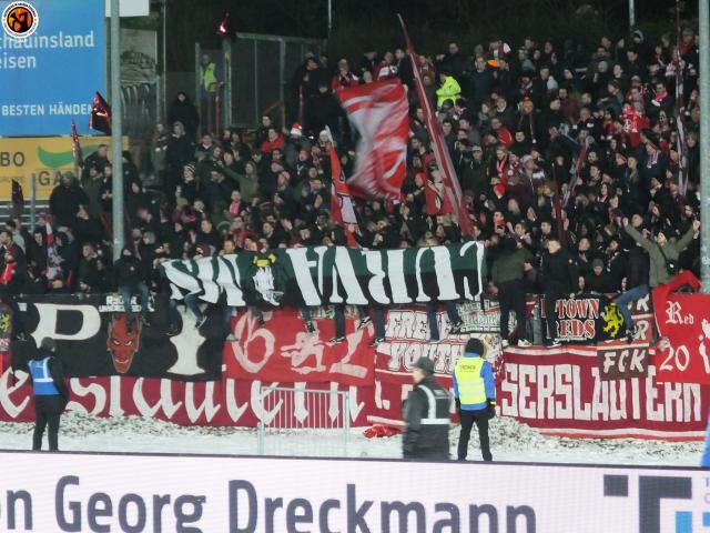 Die Ultras von Kaiserslautern haben beim Auswärtsspiel in Münster die 2011 gezogene „Curva MS“-Zaunfahne von Preußen Münster-Ultras gezeigt. Diese wurde mit mehreren Spruchbändern angekündigt.