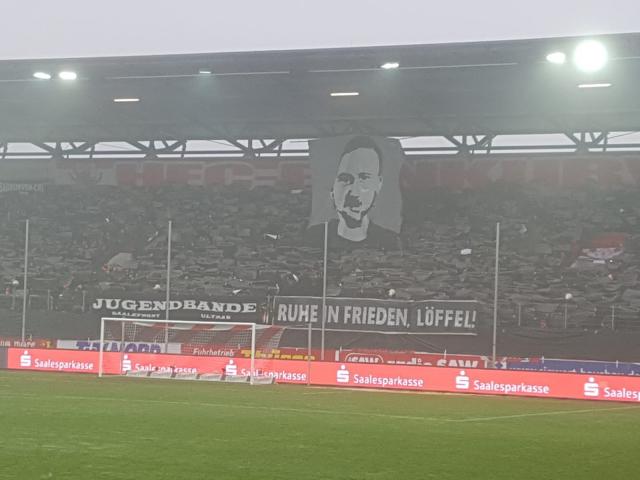 Die Fanszene des Halleschen FC hat eine Choreo in Gedenken an den verstorbenen Fan „Löffel“ gezeigt. Passend dazu wurde eine bengalische Fackel gezündet.