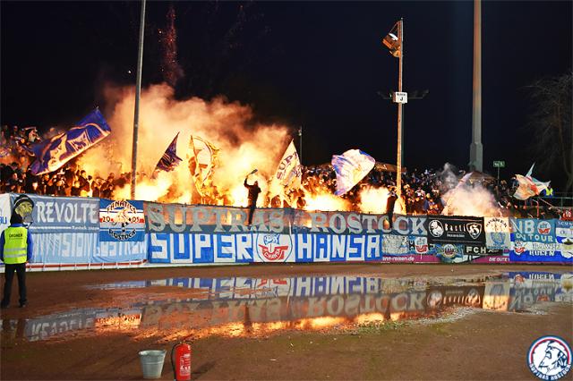 Die Fans von Hansa Rostock haben beim Spiel in Münster zwei Pyro-Shows gezeigt.